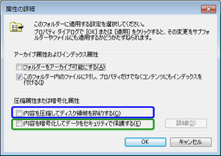 圧縮属性または暗号化属性の欄にある「内容を圧縮してディスク容量を節約する」、