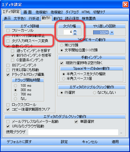 ツール → 動作設定 → エディタ設定 → 動作1