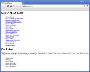 List of About pages about:about about:appcache-internals about:blob-internals about:view-http-cache about:credits about:conflicts about:dns about:flags about:gpu-internals about:histograms about:memory about:net-internals about:plugins about:stats about:sync-internals about:tcmalloc about:terms about:version For Debug The following pages are for debugging purposes only. Because they crash or hang the renderer, they're not linked directly; you can type them into the address bar if you need them. about:crash about:kill about:hang about:shorthang about:gpucrash about:gpuhang