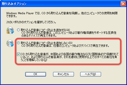 「取り込んだ音楽にコピー防止を追加しない」を選択、下の「CDから取り込む音楽が、米国及び・・・」の項目にチェックを入れ、「次へ」ボタンをクリックします。