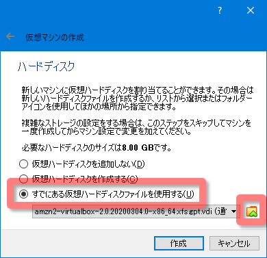 ハードディスクは、「すでにある仮想ハードディスクファイルを使用する」を選択し、フォルダマークを開きます。