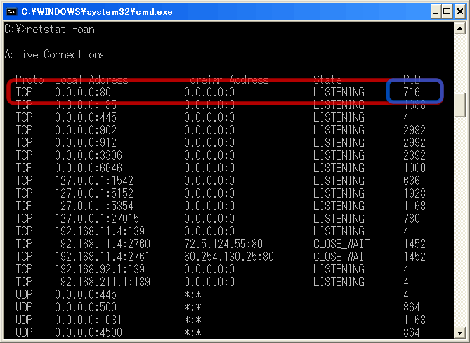 (-oはPIDの表示、-aは全ての接続を表示、-nはアドレス・ポートを数値で表示)