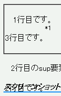 <p style="line-height:1.1;">1行目です。<br> 2行目です。<sup style="vertical-align:0.55em;">*1</sup><br> 3行目です。</p>